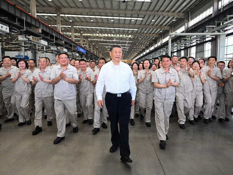 5月19日至20日,中共中央总书记、国家主席、中央军委主席习近平在河南考察。这是19日下午,习近平在洛阳轴承集团股份有限公司智能工厂考察时,同企业职工在一起。新华社记者 燕雁 摄