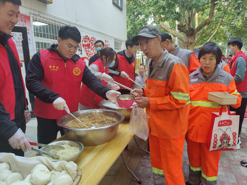 10月14日,石家庄市新华区环卫工人下班后吃上了热气腾腾的早餐。新华网 李然 摄